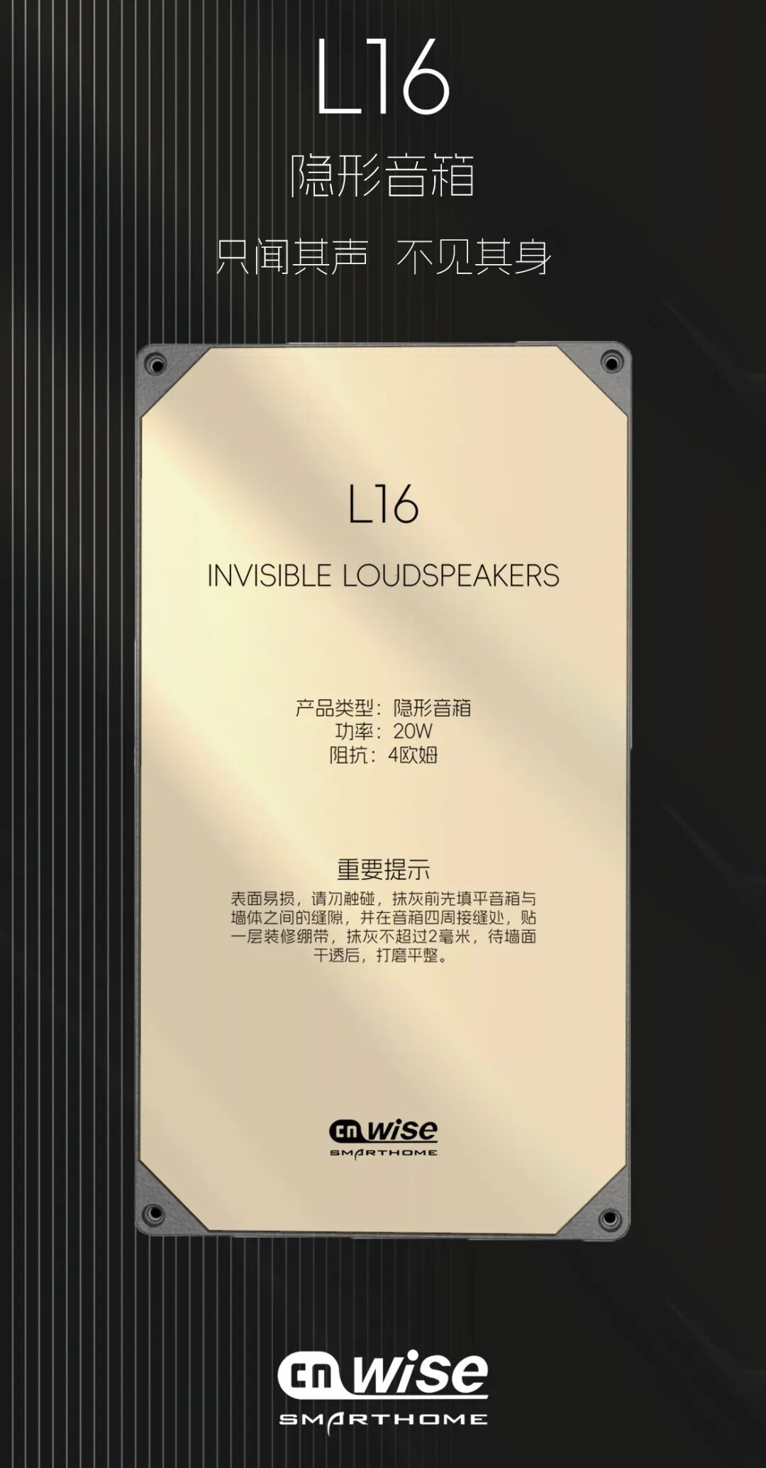 华尔思L16隐形音箱,只闻其声,不见其形。跨越空间的限制,让音乐无处不在!创造性新技术,突破行业瓶颈,真实提升低音效果,同时改善安装方式!即将上市!敬请期待!